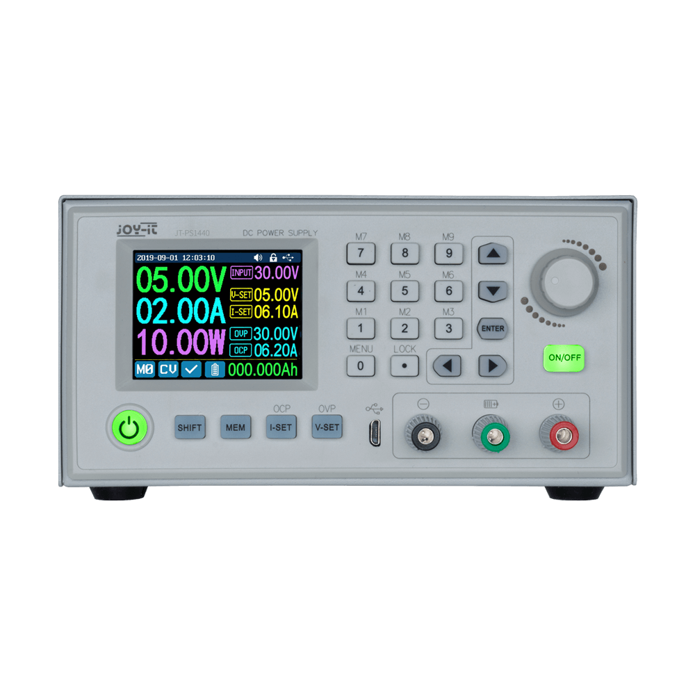 Avec le JOY-iT PS1440-C-Pro, vous disposez d'une alimentation de laboratoire programmable fournissant des tensions CC de 0,01 à 60 V et des courants CC de 0,01 à 24 A en sortie.